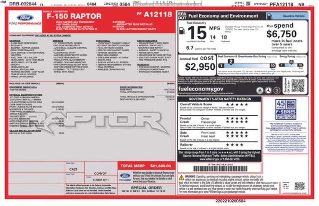 As a Ford Gold Certified pre-owned vehicle, this Raptor has undergone a rigorous 172-point inspection and comes with a comprehensive warranty package, including a 12-month/12,000-mile limited warranty and an 84-month/100,000-mile powertrain warranty. Additionally, you'll receive 22,000 FordPass Rewards Points to use towards your first two maintenance visits, ensuring your ownership experience is as seamless as possible.