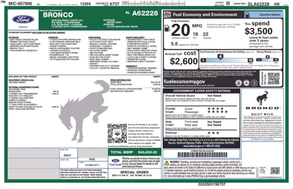 Designed to thrill, the 2025 Bronco Big Bend boasts a host of advanced features that enhance both performance and convenience. Enjoy the convenience of dual-zone electronic automatic temperature control, the added safety of Ford Co-Pilot360, and the connectivity of the FordPass performance app with off-road navigation. With a stylish Carbonized Gray exterior and a spacious, well-appointed interior, this Bronco is ready to be your trusted companion on any adventure.