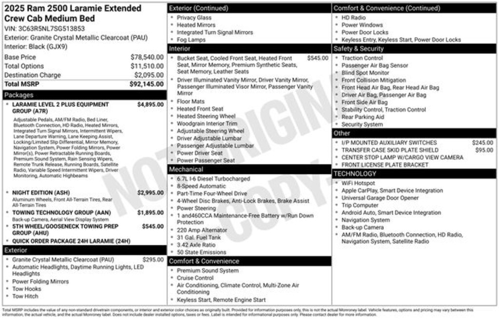 At our dealership, we're committed to providing our customers with an exceptional shopping experience. Our knowledgeable team is here to answer any questions you may have and help you find the perfect vehicle to fit your needs. Visit us today and let us show you why this 2025 Ram 2500 Laramie should be your next truck.