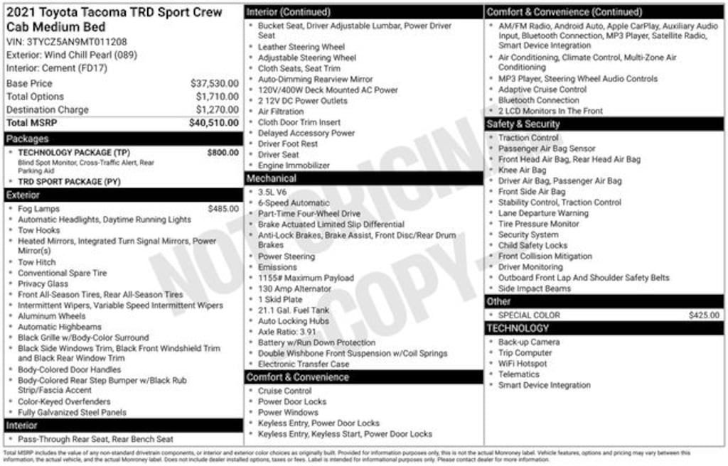 Don't miss out on this opportunity to own a truly remarkable truck. Contact us today to schedule a test drive and experience the power and versatility of the 2021 Toyota Tacoma TRD Sport V6.