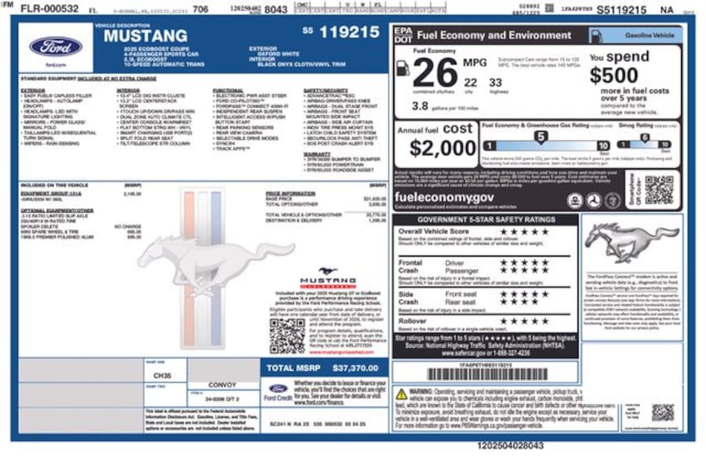 FIND IT AT FERMAN!, Free Delivery within 100 miles!, The 2025 Ford Mustang EcoBoost is a bold evolution of the legendary pony car, offering a perfect blend of turbocharged performance, sleek styling, and advanced technology. Its an ideal choice for drivers who want exhilarating power with modern efficiency and innovation. Performance & Powertrain Engine: 2.3L EcoBoost turbocharged inline-4 Horsepower: 315 hp Torque: 350 lb-ft Transmission: 10-speed automatic with SelectShift Drivetrain: Rear-wheel drive 060 mph: Approximately 5.6 seconds Fuel Economy: Approx. 26 MPG combined This powertrain delivers crisp acceleration and confident highway performance, making it fun to drive without compromising fuel efficiency. Interior & Technology 12.4-inch digital gauge cluster 13.2-inch SYNC 4 touchscreen with Apple CarPlay and Android Auto Available heated and ventilated front seats Dual-zone automatic climate control B&O premium sound system Inside, the Mustang EcoBoost offers a driver-centric cockpit with high-end materials and cutting-edge connectivity. Safety & Driver Assistance Ford Co-Pilot360 Suite Pre-Collision Assist with Automatic Emergency Braking Blind Spot Information System (BLIS) with Cross-Traffic Alert Lane-Keeping System Rear View Camera These features enhance visibility and awareness, offering peace of mind whether you're on the street or highway. Exterior Highlights 18-inch machined-face aluminum wheels with black accents LED headlamps and taillamps with sequential turn signals Dual bright exhaust tips Signature Mustang fastback silhouette The exterior blends aggressive design cues with aerodynamic enhancements, staying true to Mustang heritage while pushing into the future. Summary The 2025 Ford Mustang EcoBoost delivers thrilling performance, refined technology, and unmistakable style in a modern muscle car package. Its an ideal option for those who want Mustang attitude with turbocharged efficiency and everyday drivability., 4-Wheel Disc Brakes, 9-Speaker Stereo System, ABS brakes, Alloy wheels, Cloth/Vinyl Heated Bucket Seats, Compass, Electronic Stability Control, Equipment Group 101A High Package, Exterior Parking Camera Rear, Four wheel independent suspension, Front dual zone A/C, Fully automatic headlights, Illuminated entry, Low tire pressure warning, Power steering, Power windows, Remote keyless entry, SiriusXM w/360L & HD Radio, Steering wheel mounted audio controls, SYNC 4, Traction control. 2025 Ford Mustang EcoBoost