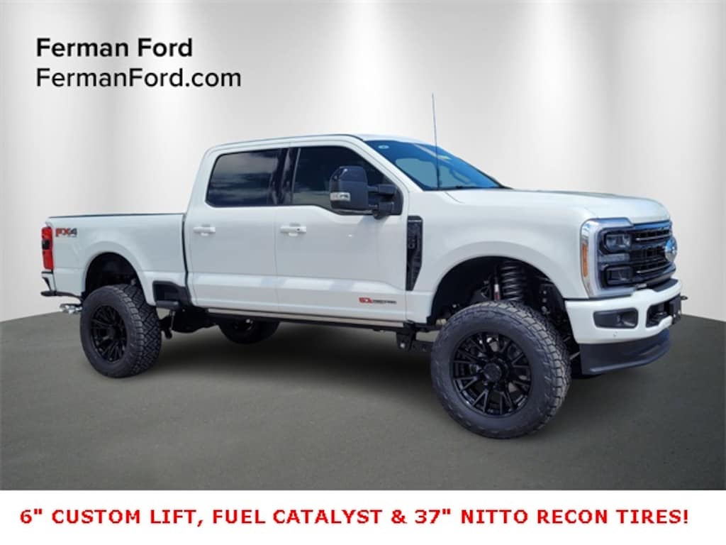 FIND IT AT FERMAN!, Free Delivery within 100 miles!, The 2025 Ford F-250 Platinum with the 6.7L High Output Power Stroke V8 Turbo Diesel delivers exceptional strength and sophistication. With over 1,200 lb-ft of torque and massive towing capacity, this heavy-duty pickup is engineered for serious work while providing a first-class driving experience. The Platinum trim elevates comfort with leather-trimmed heated and ventilated seats, a heated steering wheel, premium B&O sound system, and a large SYNC 4A touchscreen with navigation and wireless connectivity. The cabin features premium materials, power-adjustable pedals, and advanced climate control. Exterior highlights include bold Platinum styling, power-deployable running boards, LED lighting, and aluminum wheels. The truck also comes equipped with Pro Trailer Backup Assist, a 360-degree camera system, blind spot monitoring, and adaptive cruise control for confidence on the road or jobsite. Whether you're hauling heavy loads or cruising in comfort, the 2025 F-250 Platinum High Output is the perfect blend of capability and refinement., 6" LIFT, FUEL CATALYST WHEELS, 37" NITTO RECON TIRES!, 4WD, 4-Wheel Disc Brakes, ABS brakes, Alloy wheels, Automatic temperature control, Compass, Electronic Stability Control, F-250 >10K GVWR Package, Front dual zone A/C, Fully automatic headlights, FX4 Off-Road Package, Heated door mirrors, Heated front seats, Heated rear seats, Hill Descent Control, Illuminated entry, Low tire pressure warning, Memory seat, Navigation System, Off-Road Specifically Tuned Shock Absorbers, Pedal memory, Power driver seat, Power steering, Power windows, Radio: B&O Unleashed Sound System by Bang & Olufsen, Remote keyless entry, SiriusXM Radio w/360L, Steering wheel mounted audio controls, SYNC 4 w/Enhanced Voice Recognition, Traction control, Twin Panel Power Moonroof, Unique FX4 Off-Road Box Decal. Price includes $10,000 dealer added accessories.