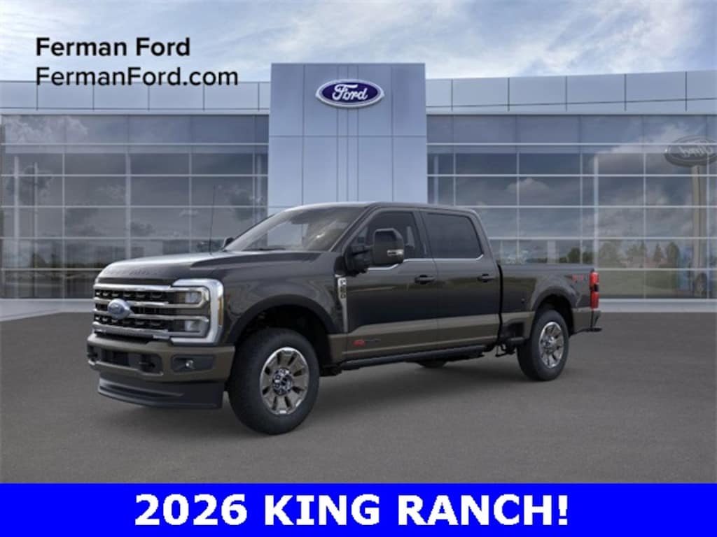 FIND IT AT FERMAN!, Free Delivery within 100 miles!, 2026 Ford F-250SD King Ranch 6.7L High Output FX4 4x4 Agate Black The 2026 Ford F-250 Super Duty King Ranch in Agate Black delivers the perfect balance of rugged strength and upscale refinement. Powered by the 6.7L High-Output Power Stroke V8 Turbo Diesel, this truck unleashes massive horsepower and torque, giving you best-in-class towing and hauling confidence. The 10-speed automatic transmission and FX4 Off-Road Packagefeaturing off-road tuned shocks, skid plates, and hill descent controlensure capability whether on the job site or the back roads. On the outside, bold King Ranch styling shines with a commanding grille, distinctive badging, and premium chrome accents. The dark Agate Black paint gives it a sleek, powerful presence, while functional touches like tow hooks, available power-deployable running boards, and LED lighting make it as practical as it is stylish. Inside, the King Ranch cabin sets a new standard of comfort. Luxurious premium leather seating, heated and ventilated front seats, memory settings, and an available twin-panel panoramic moonroof elevate every drive. Advanced technology includes a large touchscreen with navigation, wireless charging, remote start, and a 360-degree camera system, along with driver-assist features like adaptive cruise control and blind-spot monitoring. Built to perform, built to impressthe 2026 F-250SD King Ranch High Output FX4 4x4 is the truck that does it all with power, capability, and unmistakable luxury., 4WD, Automatic temperature control, Ford Connectivity Package (1-Year Included), Fully automatic headlights, FX4 Off-Road Package, Heads-Up Display, Hill Descent Control, Memory seat, Off-Road Specifically Tuned Shock Absorbers, Order Code 700A, Pedal memory, Power driver seat, Power steering, Power windows, Pro Power Onboard - 2kW, Radio: B&O Unleashed Sound System by Bang & Olufsen, Remote keyless entry, SiriusXM w/360L, Steering wheel memory, Steering wheel mounted A/C controls, Steering wheel mounted audio controls, SYNC 4 w/Enhanced Voice Recognition, Tough Bed Spray-In Bedliner, Twin Panel Power Moonroof, Unique FX4 Off-Road Box Decal.