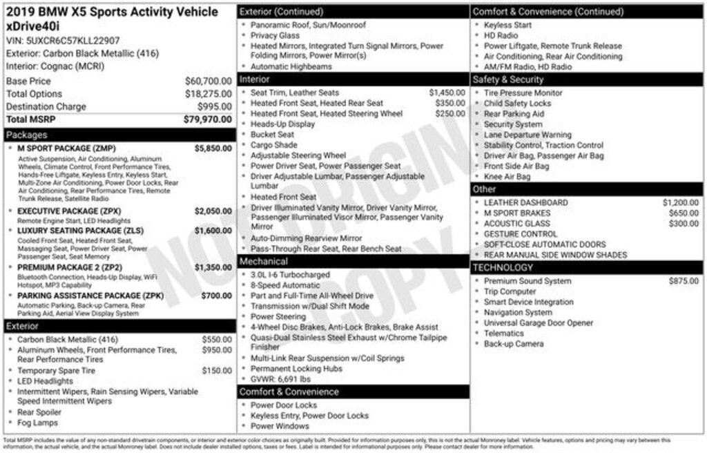 Free Delivery within 100 miles!, Cognac Leather, 10 Speakers, 3.39 Axle Ratio, 4-Wheel Disc Brakes, 4-Zone Automatic Climate Control, ABS brakes, Acoustic Glass, Adaptive M Suspension, Aerodynamic Kit, Air Conditioning, Alloy wheels, AM/FM radio, AM/FM Stereo, Apple CarPlay, Auto High-beam Headlights, Auto tilt-away steering wheel, Auto-dimming door mirrors, Auto-dimming Rear-View mirror, Automatic temperature control, Brake assist, Bumpers: body-color, Comfort Access Keyless Entry, Compass, Delay-off headlights, Driver door bin, Driver vanity mirror, Dual front impact airbags, Dual front side impact airbags, Electronic Stability Control, Emergency communication system: BMW Assist eCall, Enhanced USB & Bluetooth, Executive Package, Exterior Parking Camera Rear, Four wheel independent suspension, Front & Rear Heated Seats, Front anti-roll bar, Front Bucket Seats, Front Center Armrest, Front dual zone A/C, Front fog lights, Front Massaging Seats, Front reading lights, Front Ventilated Seats, Fully automatic headlights, Garage door transmitter, Genuine wood console insert, Genuine wood dashboard insert, Genuine wood door panel insert, Gesture Control, harman/kardon Surround Sound System, Head restraints memory, Head-Up Display, Heated & Cooled Cup Holders, Heated door mirrors, Heated Front Seats, Heated front seats, Heated Front Seats w/Armrests & Steering Wheel, Hi-Fi Sound System, High-Gloss Shadowline Roof Rails, Icon Adaptive LED Headlights w/Laserlight, Illuminated entry, Increased Top Speed Limiter, Knee airbag, Leather Dashboard, Leather Shift Knob, Leather steering wheel, Low tire pressure warning, Lumbar Support, Luxury Seating Package, M Sport Brakes, M Sport Package, M Sport Package (337), M Steering Wheel, Memory seat, Multi-Contour Seats, Navigation System, Occupant sensing airbag, Outside temperature display, Overhead airbag, Panic alarm, Parking Assistance Package, Parking Assistant Plus, Passenger door bin, Passenger vanity mirror, Power adjustable front head restraints, Power door mirrors, Power driver seat, Power Front Seats, Power moonroof, Power passenger seat, Power steering, Power windows, Premium Package 2, Radio data system, Rain sensing wipers, Rear air conditioning, Rear anti-roll bar, Rear Manual Side Window Shades, Rear reading lights, Rear seat center armrest, Rear window defroster, Rear window wiper, Rear-View Camera, Remote Engine Start, Remote keyless entry, Roof rack: rails only, Security system, SensaTec Upholstery, Shadowline Exterior Trim, SiriusXM Satellite Radio w/1 Year All Access, Soft-Close Automatic Doors, Speed control, Speed-sensing steering, Speed-Sensitive Wipers, Split folding rear seat, Spoiler, Sport Seats, Sport steering wheel, Steering wheel memory, Steering wheel mounted audio controls, Surround View w/3D View, Tachometer, Telescoping steering wheel, Tilt steering wheel, Traction control, Trip computer, Turn signal indicator mirrors, Variably intermittent wipers, Vernasca Leather Upholstery, Wheels: 19" x 9" V-Spoke (Style 734), Wheels: 20" x 9" M Star-Spoke Bi-Color, Wheels: 21" x 9.5" Fr & 21" x 10" Rr M Y-Spoke, WiFi Hotspot, Wireless Charging, Without Lines Designation Outside, Cognac Leather. 2019 BMW X5 xDrive40i