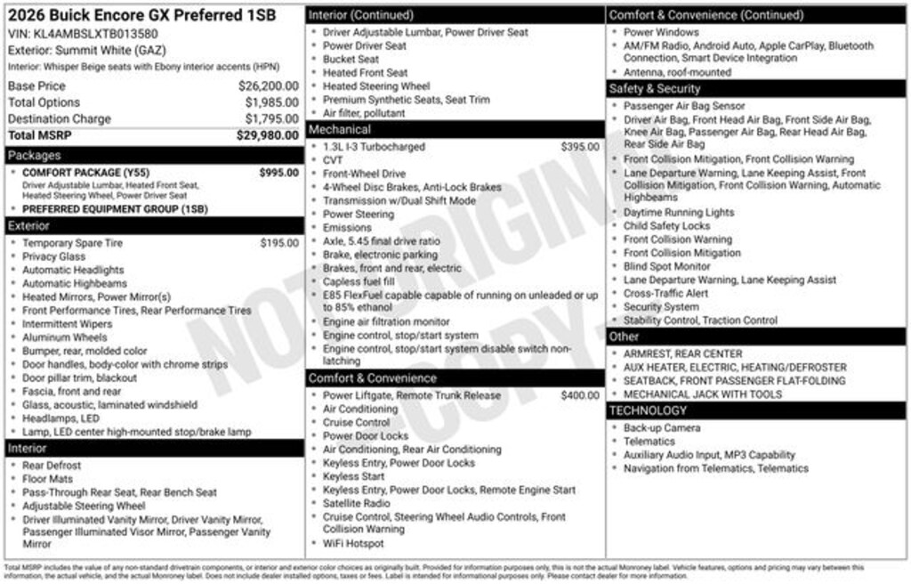 Free Delivery within 100 miles!, 2-Way Power Driver Lumbar Control, 4-Way Manual Passenger Seat Adjuster, 4-Wheel Disc Brakes, 5.45 Final Drive Axle Ratio, 6 Speakers, 6-Way Manual Driver Seat Adjuster, 8-Way Power Driver Seat Adjuster, ABS brakes, Air Conditioning, Alloy wheels, AM/FM radio: SiriusXM, Auto High-beam Headlights, Automatic temperature control, Brake assist, Bumpers: body-color, Cloth with Leatherette Seat Trim, Comfort Package, Compass, Delay-off headlights, Driver door bin, Driver vanity mirror, Dual front impact airbags, Dual front side impact airbags, Electric Auxiliary Heating/Defroster, Electronic Stability Control, Emergency communication system: OnStar and Buick connected services capable, Enhanced Performance 6-Speaker System, Flat-Folding Front Passenger Seatback, Front anti-roll bar, Front Bucket Seats, Front Center Armrest, Front reading lights, Front wheel independent suspension, Fully automatic headlights, Heated door mirrors, Heated Driver and Front Passenger Seats, Heated Steering Wheel, Illuminated entry, Knee airbag, Low tire pressure warning, Mechanical Jack with Tools, Occupant sensing airbag, Outside temperature display, Overhead airbag, Overhead console, Panic alarm, Passenger door bin, Passenger vanity mirror, Power door mirrors, Power Liftgate, Power steering, Power windows, Preferred Equipment Group 1SB, Radio data system, Radio: AM/FM Audio System, Rear Center Armrest, Rear reading lights, Rear side impact airbag, Rear window defroster, Rear window wiper, Remote keyless entry, Ride and Handling Suspension, Security system, SiriusXM Trial Subscription, Speed control, Speed-sensing steering, Split folding rear seat, Spoiler, Steering wheel mounted audio controls, Tachometer, Telescoping steering wheel, Tilt steering wheel, Traction control, Trip computer, Variably intermittent wipers, Wheels: 18" Bright Silver Painted Aluminum, Wireless Apple CarPlay/Wireless Android Auto. 2026 Buick Encore GX Preferred