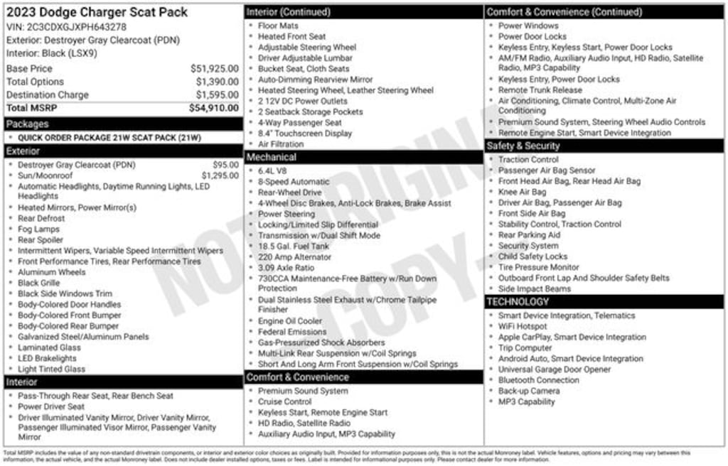 Boasting a robust SRT HEMI 6.4L V8 engine mated to an 8-speed automatic transmission, this Charger R/T Scat Pack delivers an exhilarating driving experience that will leave you craving the open road. Enjoy the convenience of rear-wheel drive and the confidence of advanced safety features, including electronic stability control and brake assist.