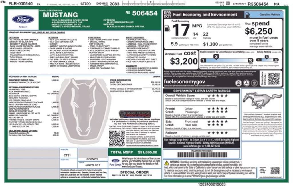 Free Delivery within 100 miles!, 12 Speakers, 4-Wheel Disc Brakes, ABS brakes, Adaptive suspension, Air Conditioning, Alloy wheels, AM/FM radio: SiriusXM with 360L, AM/FM Stereo, Auto High-beam Headlights, Auto-dimming Rear-View mirror, Automatic temperature control, B&O Sound System by Bang & Olufsen, Brake assist, Bumpers: body-color, Cloth/Vinyl Heated Bucket Seats, Compass, Delay-off headlights, Driver door bin, Driver vanity mirror, Dual front impact airbags, Dual front side impact airbags, Electronic Stability Control, Emergency communication system: 911 Assist, Exterior Parking Camera Rear, Four wheel independent suspension, Front anti-roll bar, Front Bucket Seats, Front Center Armrest, Front dual zone A/C, Front reading lights, Fully automatic headlights, HD Radio, Heated front seats, Heated steering wheel, Illuminated entry, Knee airbag, Low tire pressure warning, Navigation system: Connected Navigation, Occupant sensing airbag, Outside temperature display, Overhead airbag, Overhead console, Panic alarm, Passenger door bin, Passenger vanity mirror, Power door mirrors, Power driver seat, Power passenger seat, Power steering, Power windows, Radio data system, Rain sensing wipers, Rear anti-roll bar, Rear Parking Sensors, Rear window defroster, Remote keyless entry, SiriusXM w/360L, Speed control, Speed-sensing steering, Speed-Sensitive Wipers, Split folding rear seat, Spoiler, Sport steering wheel, Steering wheel mounted audio controls, SYNC 4.0 QNX, Tachometer, Telescoping steering wheel, Tilt steering wheel, Traction control, Trip computer, Variably intermittent wipers, Voltmeter, Wheels: 19" x 9.5" Fr & 19" x 10" Rr Aluminum. 2024 Ford Mustang Dark Horse