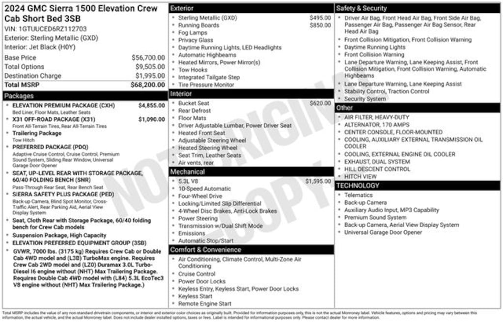 Elevate your driving experience with the Sierra 1500 Elevation's impressive array of features. The Elevation Premium Package includes a Preferred Package, Jet Black Leather interior, Up-level Rear Seat with Storage, Sierra Safety Plus Package, All-Weather Floormats, and a spray-on bedliner. The X31 Off-Road Package further enhances the vehicle's off-road capabilities with features like Off-Road Suspension, Hill Descent Control, and all-terrain tires.