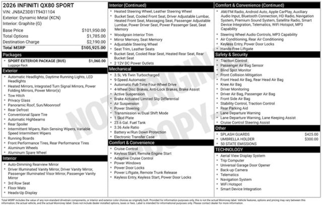 Crafted with the discerning driver in mind, this 2026 INFINITI QX80 SPORT is a true masterpiece of automotive engineering. Experience the difference for yourself â" visit our showroom and let us demonstrate why this exceptional SUV should be your next vehicle.