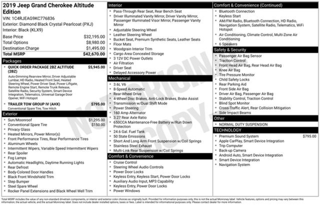 Free Delivery within 100 miles!, 1-Year SiriusXM Radio Service, 1-Yr SiriusXM Guardian Trial, 115V Auxiliary Power Outlet, 180 Amp Alternator, 3.27 Rear Axle Ratio, 4-Wheel Disc Brakes, 4G LTE Wi-Fi Hot Spot, 5-Year SiriusXM Traffic Service, 5-Year SiriusXM Travel Link Service, 506 Watt Amplifier, 6 Speakers, 7 & 4 Pin Wiring Harness, 8.4" Touchscreen Display, ABS brakes, Active Noise Control System, Air Conditioning, Alloy wheels, Altitude Grille, Altitude IV Package, AM/FM radio, Anti-whiplash front head restraints, Apple CarPlay, Apple CarPlay/Android Auto, Auto-Dimming Rear-View Mirror, Automatic temperature control, Black Suede Seats w/Black Stitching, Body Color Claddings, Body Color Fascia, Body Color Shark Fin Antenna, Brake assist, Bumpers: body-color, Cargo Compartment Cover, Class IV Receiver Hitch, Cloth Bucket Seats, Compass, Dark Day Light Opening Moldings, Dark Headlamp Bezel Finish, Dark Lens Taillamps, Delay-off headlights, Driver door bin, Driver vanity mirror, Dual front impact airbags, Dual front side impact airbags, Eco Suspension I, Electronic Stability Control, Four wheel independent suspension, Front Accent/Body Color Fascia, Front anti-roll bar, Front Bucket Seats, Front Center Armrest w/Storage, Front dual zone A/C, Front fog lights, Front reading lights, Fully automatic headlights, Gloss Black Rear Fascia Applique, Google Android Auto, GPS Antenna Input, GPS Navigation, HD Radio, Heated door mirrors, Heated Front Seats, Heated Steering Wheel, Heavy-Duty Engine Cooling, Illuminated entry, Integrated Center Stack Radio, Integrated Voice Command w/Bluetooth, Jeep Black Gloss Badging, Knee airbag, Leather Shift Knob, Low tire pressure warning, Normal Duty Suspension, Occupant sensing airbag, Outside temperature display, Overhead airbag, Overhead console, Panic alarm, ParkView Rear Back-Up Camera, Passenger door bin, Passenger vanity mirror, Power 4-Way Driver Lumbar Adjust, Power 8-Way Driver/Manual Passenger Seat, Power door mirrors, Power Liftgate, Power steering, Power Sunroof, Power windows, Premium Alpine Speaker System, Quick Order Package 2BZ Altitude, Radio data system, Radio: Uconnect 4 w/7" Display, Radio: Uconnect 4C Nav w/8.4" Display, Rear Accent/Body Color Fascia, Rear anti-roll bar, Rear Fascia Black MIC Step Pad, Rear Load Leveling Suspension, Rear reading lights, Rear seat center armrest, Rear window defroster, Rear window wiper, Remote keyless entry, Security & Convenience Group, Security Alarm, Single Exhaust w/Bright Tip, SiriusXM Satellite Radio, SiriusXM Traffic Plus, SiriusXM Travel Link, Speed control, Speed-sensing steering, Speed-Sensitive Wipers, Split folding rear seat, Spoiler, Steering Wheel Mounted Audio Controls, Steering wheel mounted audio controls, Tachometer, Telescoping steering wheel, Tilt steering wheel, Traction control, Trailer Tow Group IV, Trip computer, Universal Garage Door Opener, USB Host Flip, Variably intermittent wipers, Wheels: 17" x 8.0" Silver Aluminum, Wheels: 20" x 8.0" Gloss Black Aluminum. 2019 Jeep Grand Cherokee Altitude