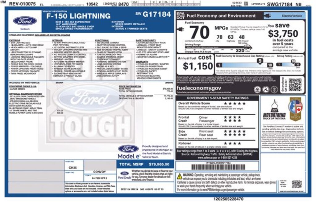 Free Delivery within 100 miles!, 4-Wheel Disc Brakes, 8 Speakers, ABS brakes, ActiveX Trimmed Heated & Ventilated Seats, Adjustable pedals, Air Conditioning, Alloy wheels, Auto High-beam Headlights, Auto tilt-away steering wheel, Auto-dimming door mirrors, Auto-dimming Rear-View mirror, Automatic temperature control, Brake assist, Bumpers: body-color, Compass, Delay-off headlights, Driver door bin, Driver vanity mirror, Dual front impact airbags, Dual front side impact airbags, Electronic Stability Control, Emergency communication system: SYNC 4 911 Assist, Equipment Group 511A Standard, Four wheel independent suspension, Front anti-roll bar, Front Bucket Seats, Front Center Armrest, Front dual zone A/C, Front reading lights, Fully automatic headlights, Heated door mirrors, Heated front seats, Heated rear seats, Heated steering wheel, Illuminated entry, Illuminated running boards, Internet access capable: FordPass Connect 4G, Knee airbag, Low tire pressure warning, Memory seat, Mobile Power Cord (120/240V), Navigation system: Connected Navigation, Occupant sensing airbag, Outside temperature display, Overhead airbag, Overhead console, Panic alarm, Passenger door bin, Passenger vanity mirror, Pedal memory, Power door mirrors, Power driver seat, Power moonroof, Power passenger seat, Power steering, Power windows, Radio data system, Radio: B&O Sound System by Bang & Olufsen, Rain sensing wipers, Rear anti-roll bar, Rear reading lights, Rear seat center armrest, Rear step bumper, Rear window defroster, Remote keyless entry, Security system, Speed control, Speed-sensing steering, Split folding rear seat, Steering wheel memory, Steering wheel mounted audio controls, SYNC 4A w/Enhanced Voice Recognition, Telescoping steering wheel, Tilt steering wheel, Traction control, Trip computer, Turn signal indicator mirrors, Variably intermittent wipers, Ventilated front seats, Wheels: 20" Alloy Dark Carbonized Gray. 2025 Ford F-150 Lightning Lariat